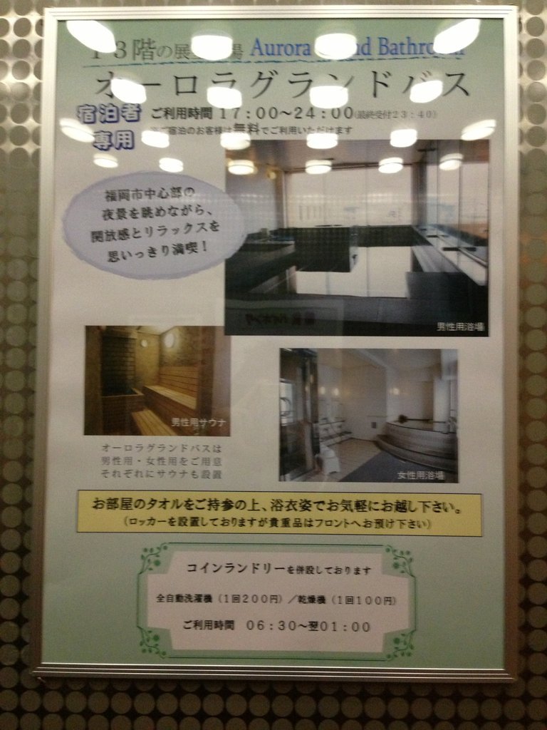 ・大浴場は広く、福岡の街が一望でき解放感がある。また脱衣所にコインランドリーがあるため、女性は気兼ねなく使えるかもしれない